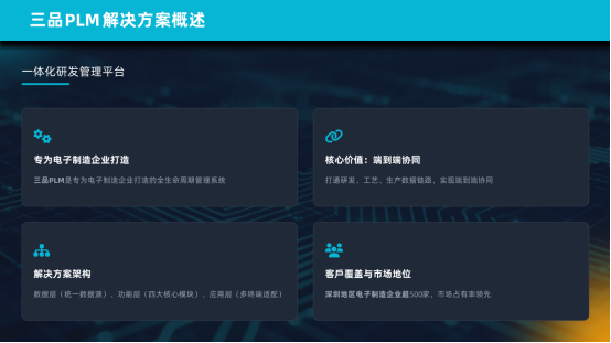 核心要點:三品PLM系統專為電子制造行業打造,以產品數據為核心,打通從概念設計到生產制造的完整鏈路,實現數據、流程、人員的全面協同。