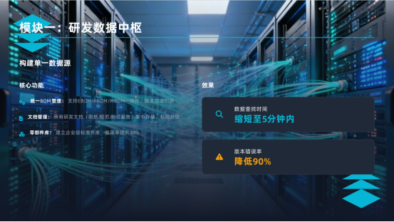 ○具體內容:提供從基礎數據管理到高級項目協同的模塊化、可擴展的解決方案,支持分階段投入。針對中小型電子制造企業,有經過驗證的輕量化快速部署方案,控制初期成本,快速見效。